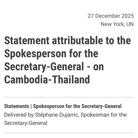 柬单网报道,联合国秘书长发言人斯特凡·杜加里克于12月27日在纽约发表声明,对柬埔寨与泰国达成停火协议表示欢迎。联合国秘书长认为,此举是缓解平民苦难、结束当前敌对行动,并为实现持久和平创造有利环境的积极一步。