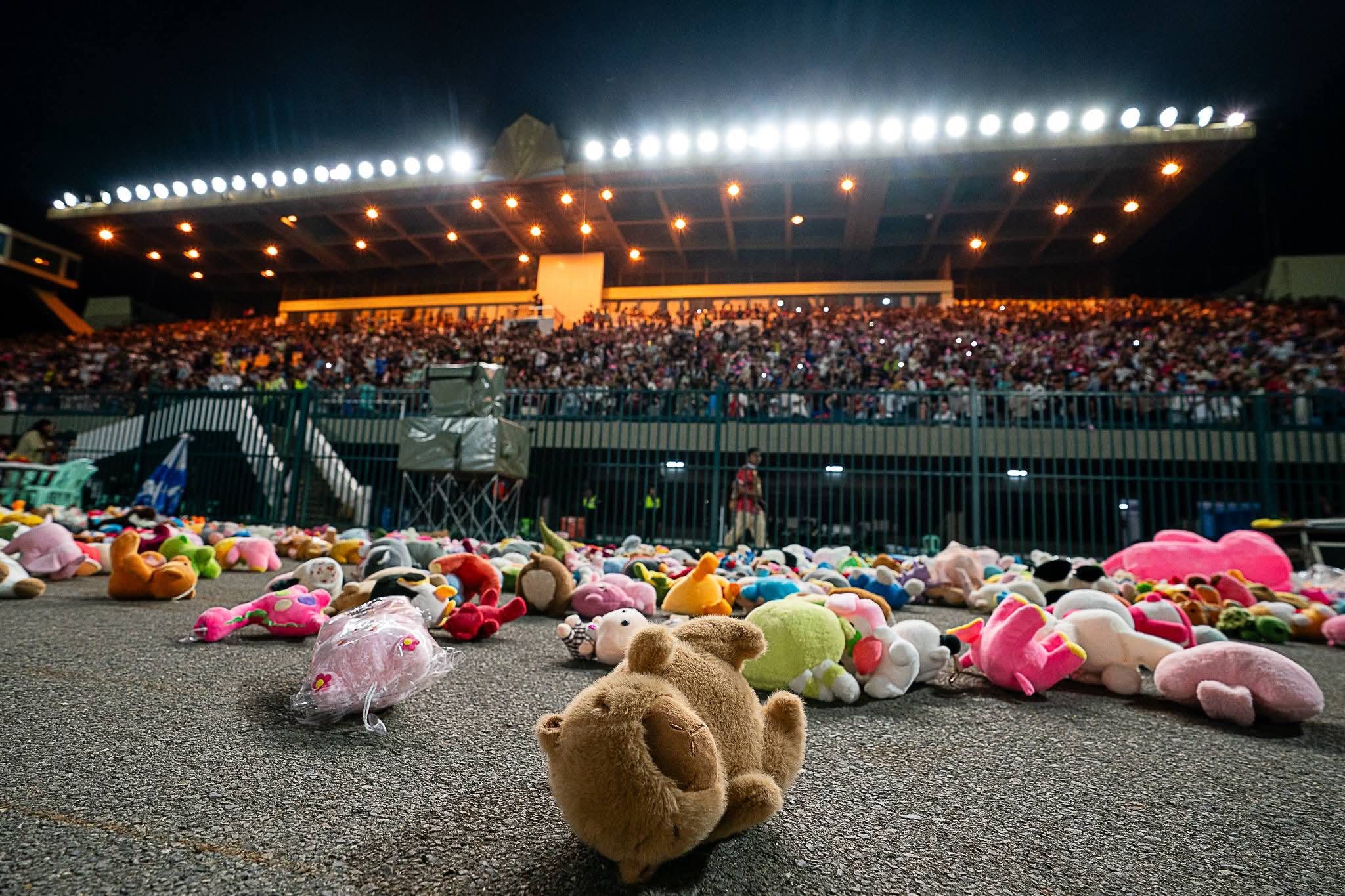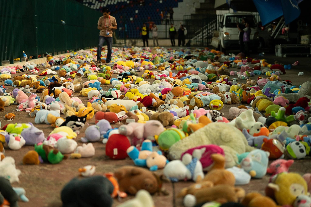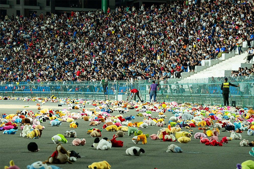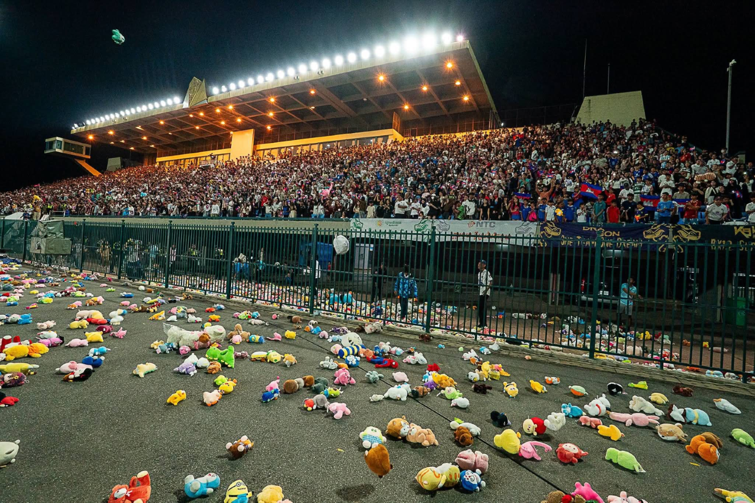 比赛期间,看台上出现温馨一幕:众多观众将事先准备好的娃娃、玩偶投向球场,作为爱心捐赠,送给因近期柬泰边境局势受到影响的儿童。
