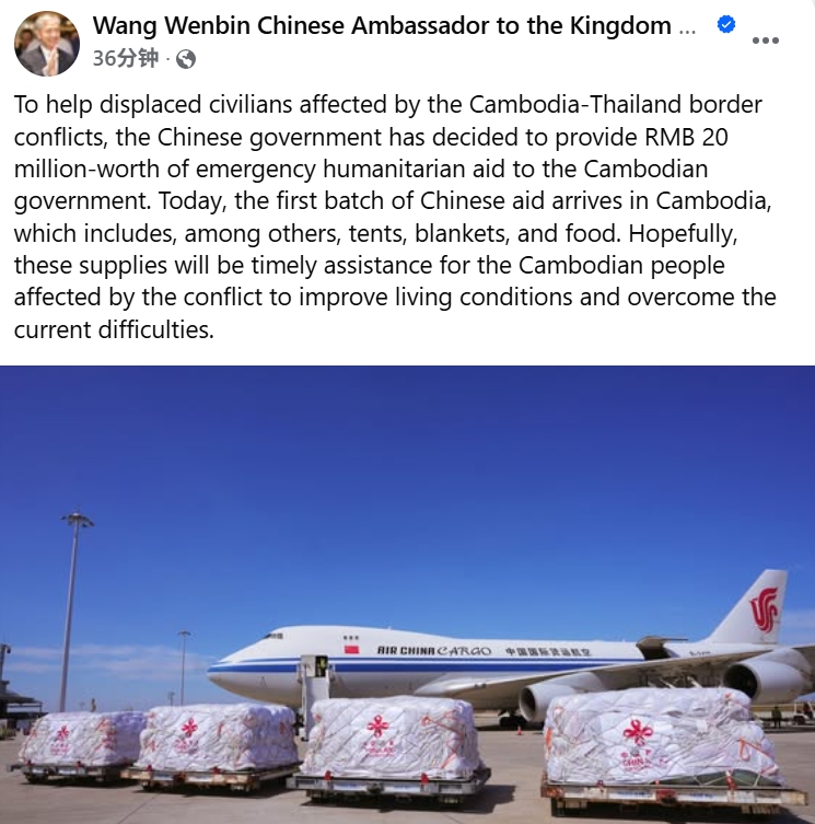 28日下午,中国驻柬埔寨大使汪文斌通过社媒发文称,为缓解柬泰边境冲突对当地平民造成的影响,中国政府决定向柬埔寨政府提供价值2000万元人民币的紧急人道主义物资援助。