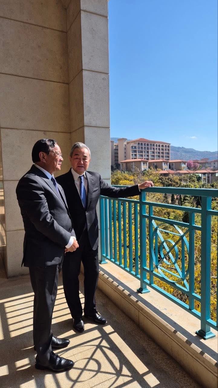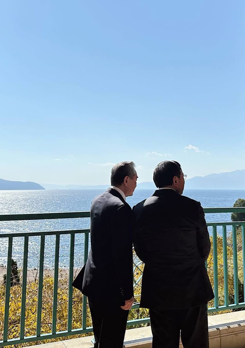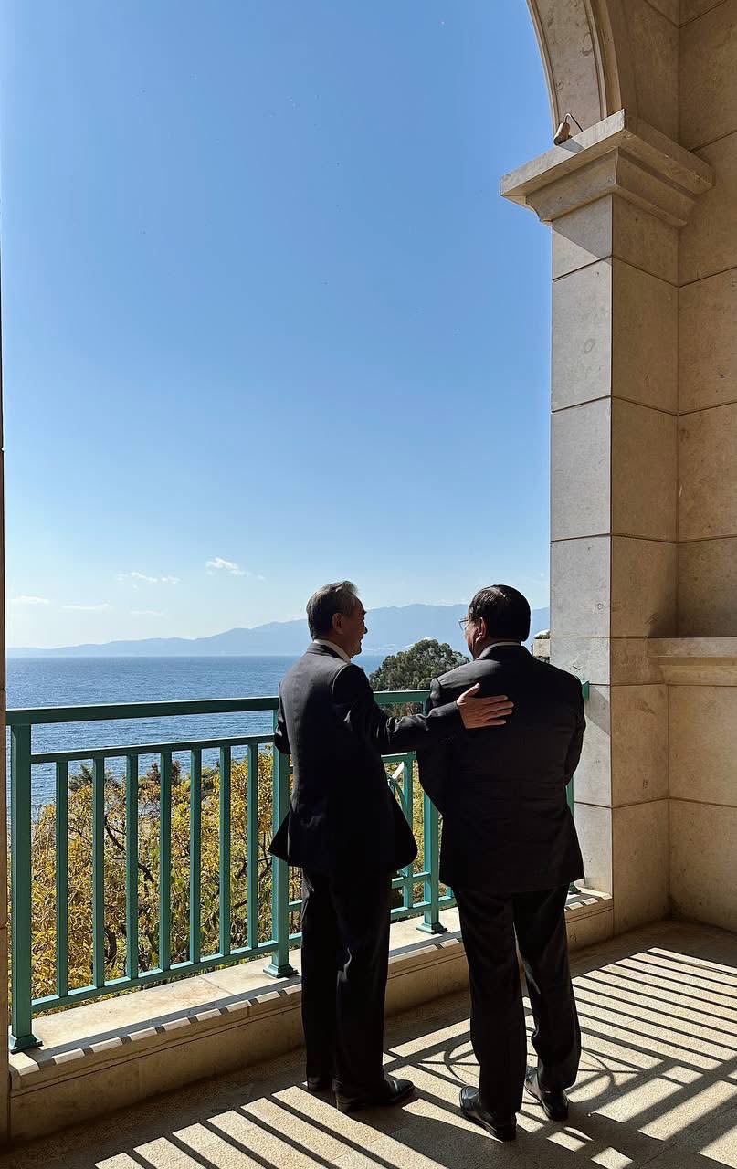 柬单网报道,12月28日,在双边会谈结束后,柬埔寨副首相兼外交与国际合作部部长巴速坤与中国国务委员兼外交部长王毅抽空一同驻足,远眺云南抚仙湖的秀美景色。