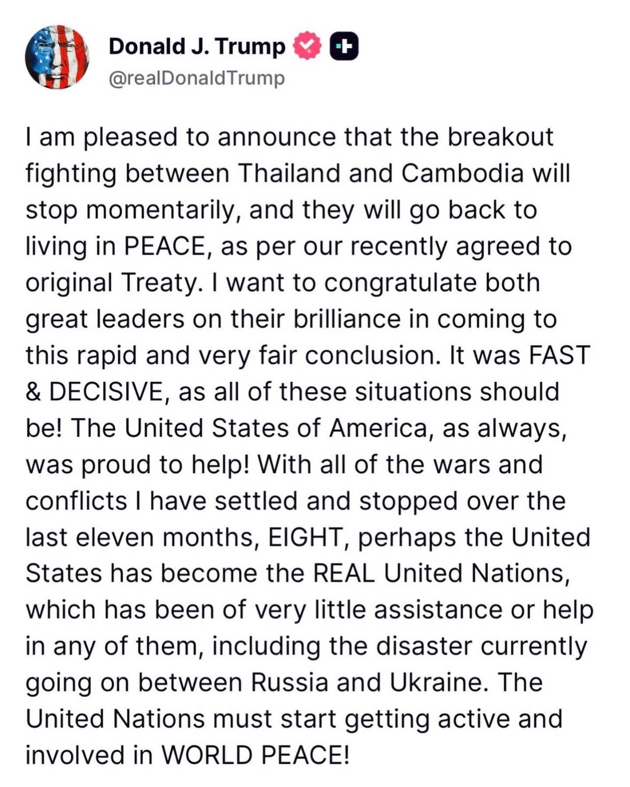 特朗普在帖文中表示:“我谨向两位卓越的领导人表示祝贺,赞赏他们以智慧促成了这一迅速而公正的结果。这一进程非常果断、高效。”他同时强调,美国对在促成双方停火与和平进程中发挥的斡旋作用感到“非常自豪”。在同一则声明中,特朗普还猛烈抨击联合国,称美国事实上已成为“真正的联合国”。他指出,在过去11个月内,美国已成功介入并促成8场冲突或战争的解决。