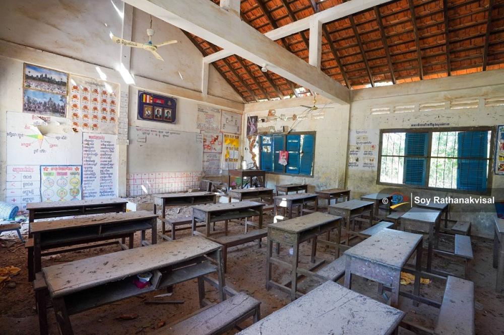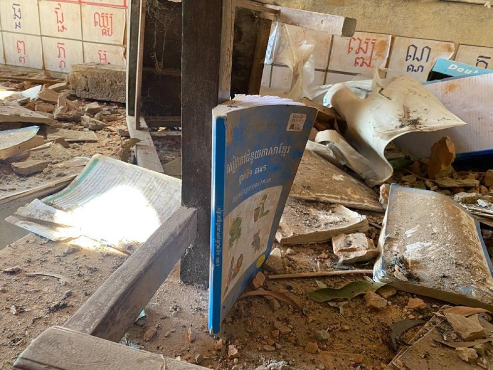 原本热闹的校园目前仅剩残破的教学楼和遍布各处的弹坑。受泰军多次向校内及周边区域实施炮击影响,学校已无法开展正常教学,呈现出“有校无生”的现状。