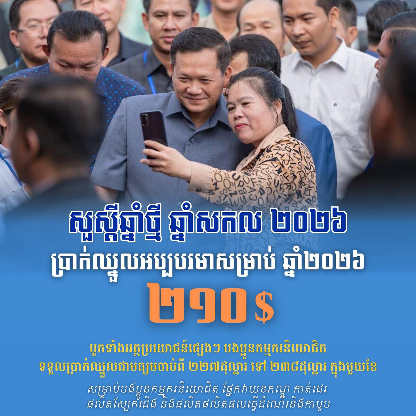 柬单网报道,1月1日,洪玛耐首相通过官方脸书向服装、鞋类及旅行用品制造行业的工人致贺,宣布自本月起,从事裁剪、缝纫及相关生产工作的员工,月最低工资将提升至210美元。