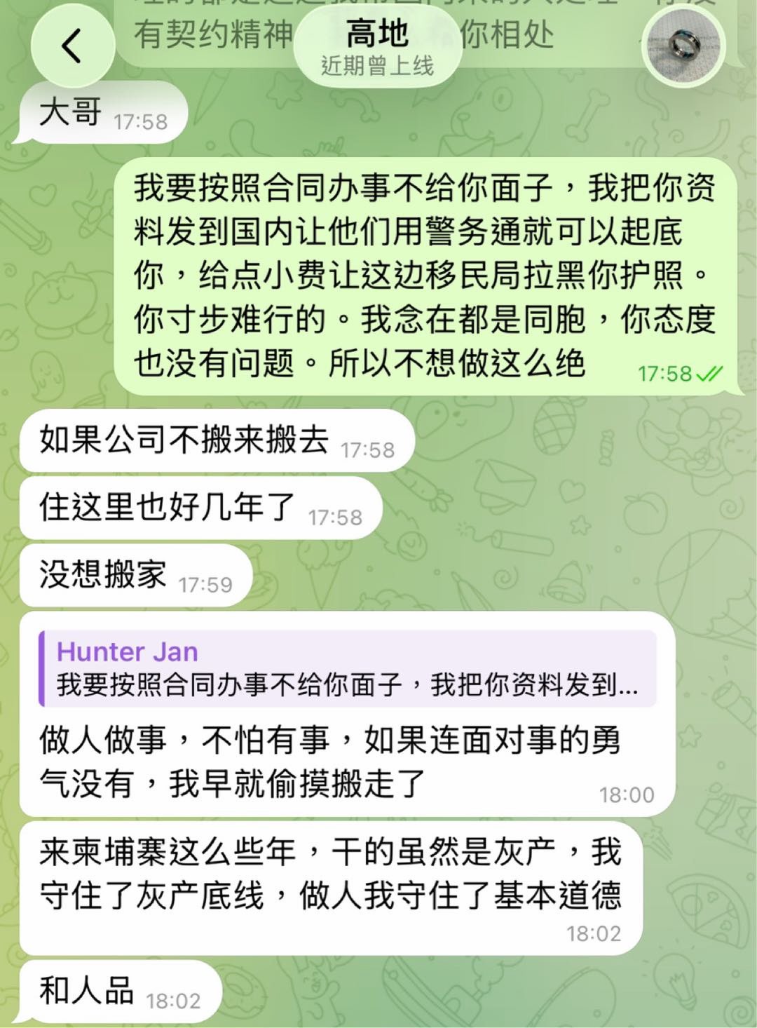(微信名:顽皮。飞机号:@Jpz_Gd0077,@Jpz_Gd077。飞机名:高地)真实名字:王某勇,中国云南籍。于2023年9月30号租我本人公寓至今2026年1月6号仍欠多月租金、水电费和物业费等费用共计:5000多美金。本着友好原则多次协商催收房租欠款无果。通过曝光此人毫无契约精神,此人有吸毒史,满嘴跑火车。同时提醒同胞,房东,中介注意防范。他本人公司在木牌,与他有业务来往的园区老板,合作股东注意避雷!