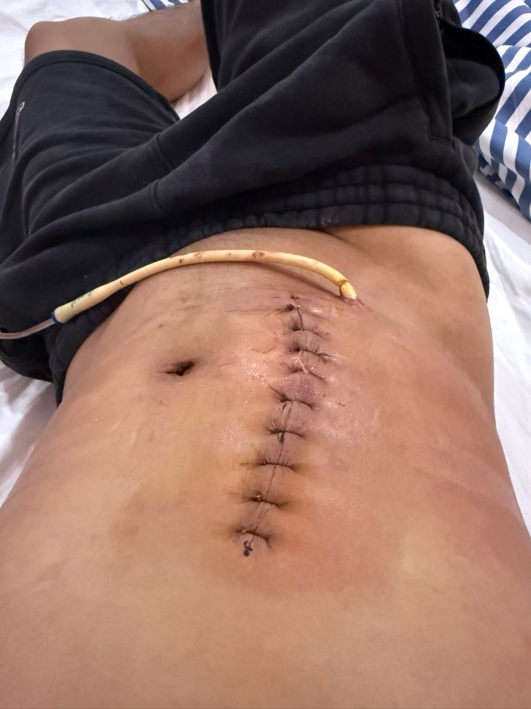 腹部被切开远超普通阑尾炎所需范围 术后留下明显、过大的纵向切口 术后恢复过程异常痛苦 伤口随后出现化脓、感染等严重并发症 至今仍需承受身体与心理的双重压力