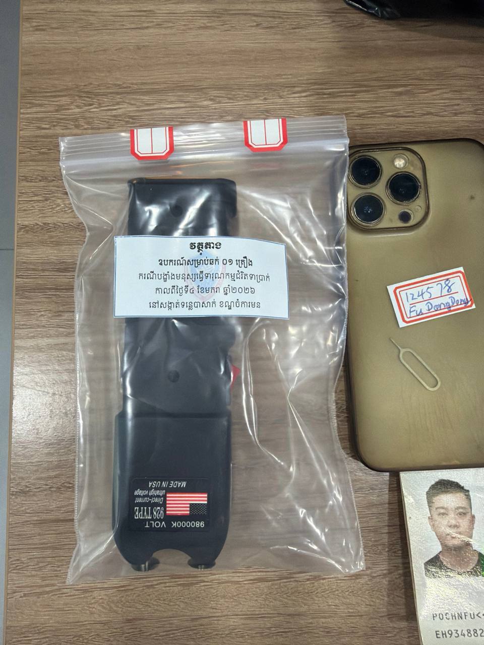 行动中,警方在上述酒店内发现一名重伤受害者。同时,当场抓获马智伟被认定为案件策划者。警方还在40-09号房内查获作案工具,包括1件黑色电击装置及1张灰色桌布(用于蒙盖受害人面部),并将相关证物及2名涉案人员带回金边市警察局进一步讯问。