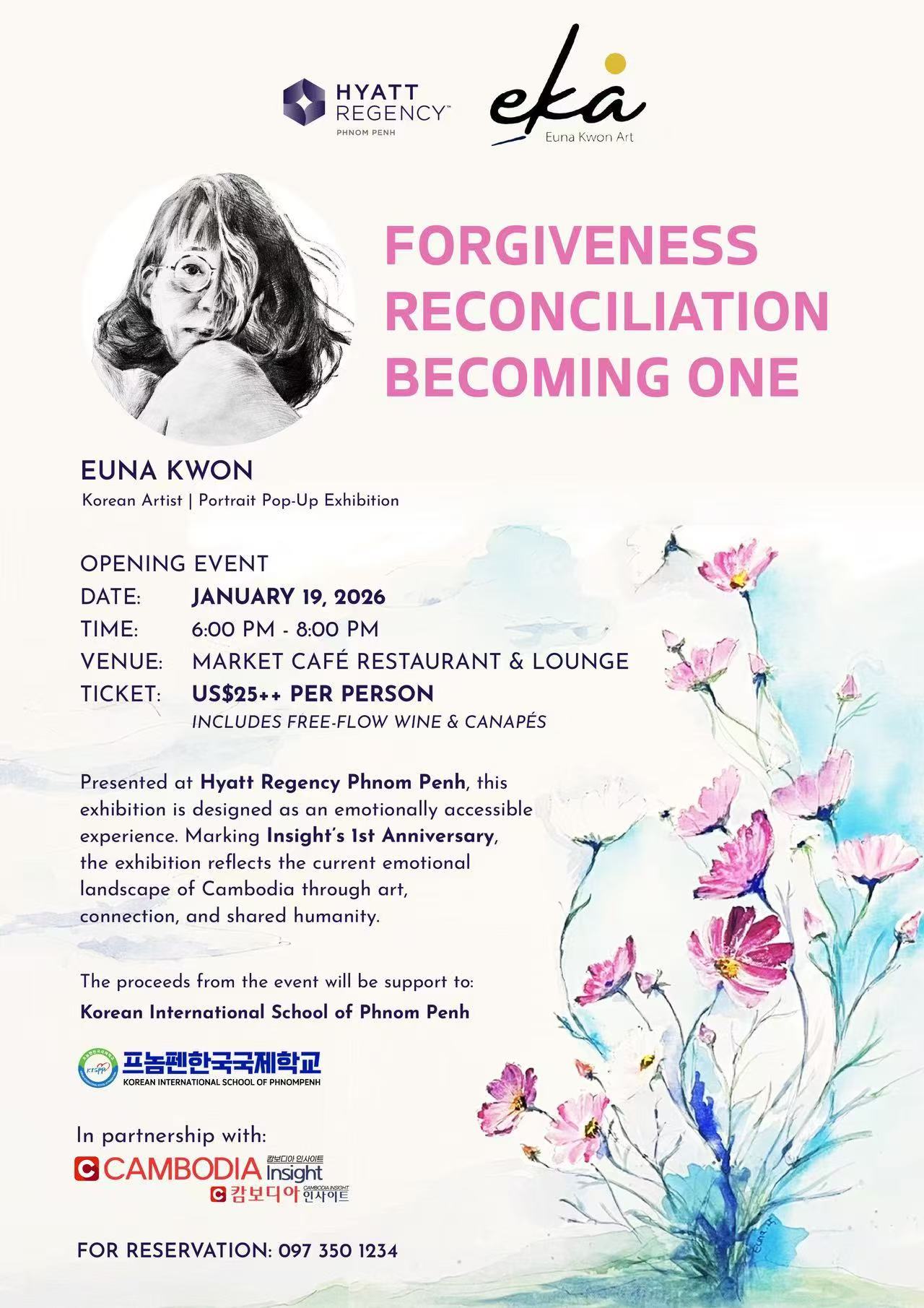 展览将于 2026年1月19日(周一)下午6时 在金边凯悦酒店(Hyatt Regency Phnom Penh)举行开幕活动,并持续展出至 1月31日。活动现场无限量红酒与精致小食。开幕活动入场券为 每人25美元起,活动所得将用于支持金边韩国国际学校的发展基金。