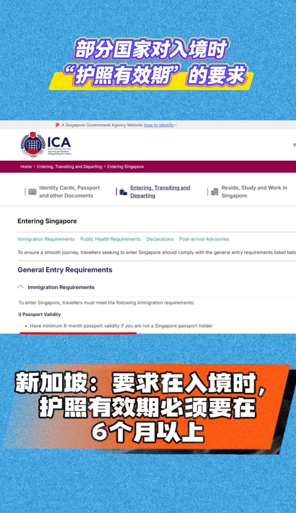 新加坡:要求在入境时,护照有效期必须要在6个月以上。