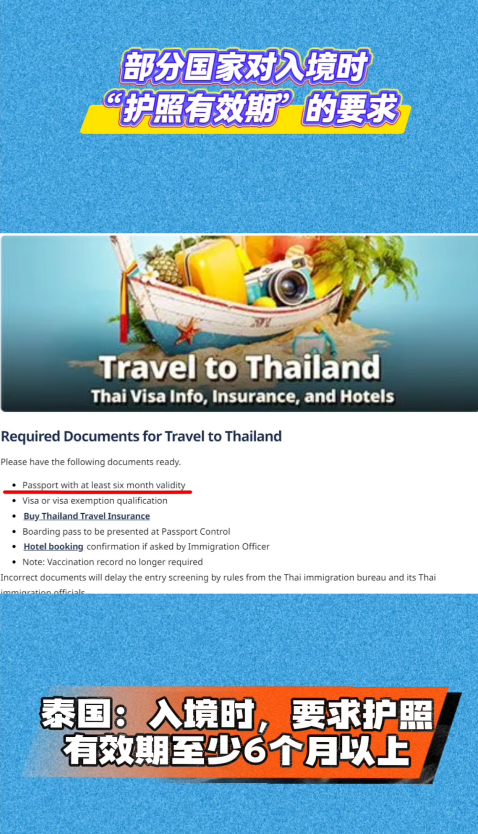 泰国:入境时,要求护照有效期至少6个月以上。