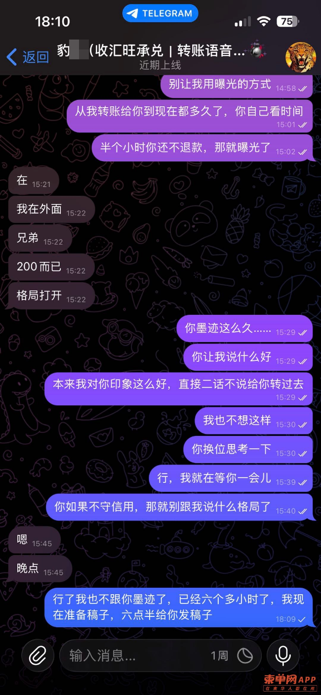 此人找我换两百,价格也说好了的,钱转过去后直接已读不回,一直在拖,最后居然这么耍人也不退款,还好意思跟我论格局…… 曝光此人,纯纯骗子