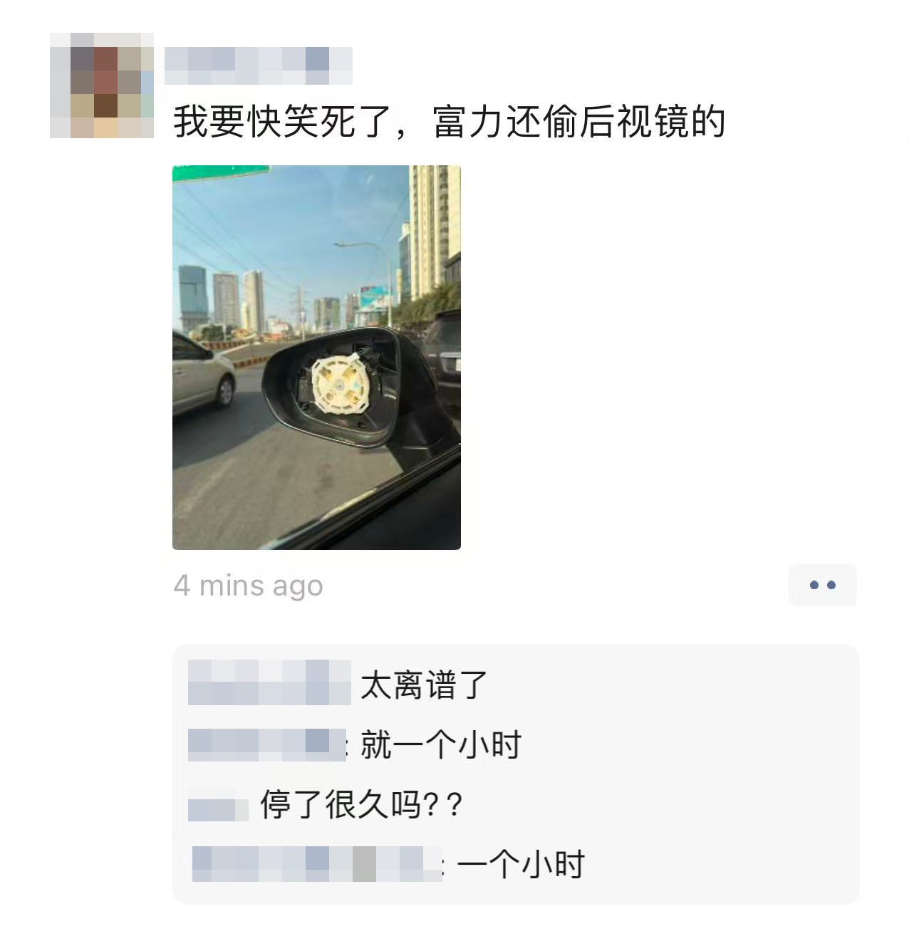 朋友圈看到的,属实有点夸张。富力停车1小时,后视镜被偷。车主们最近停车还是多注意吧。