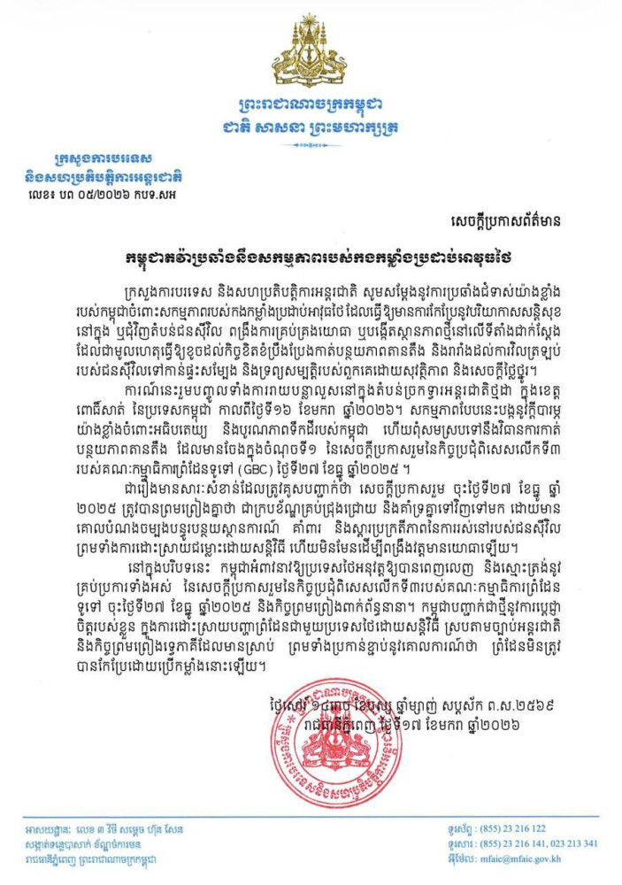 柬单网报道,柬埔寨外交部于2026年1月17日发布通告,就泰国军队在边境地区的行动正式提出严重抗议,并表示将就此向泰方发出外交照会。