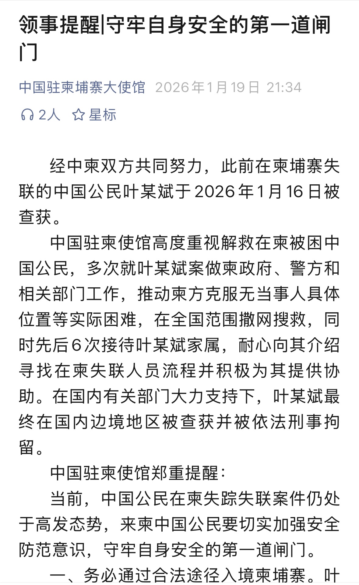 此外,中国驻柬埔寨大使馆也于同日发布通告称,在中柬双方共同努力下,失联中国公民叶某某于2026年1月16日被查获。使馆多次就此案做柬政府及相关部门工作,并在国内有关部门支持下推动解救进程,同时先后六次接待家属,为其提供协助。使馆强调,偷渡入境属违法行为,极大增加安全风险;在柬电诈园区亦是人身安全案件的高发区域,提醒在柬中国公民务必通过合法途径入境,远离电信网络诈骗。
