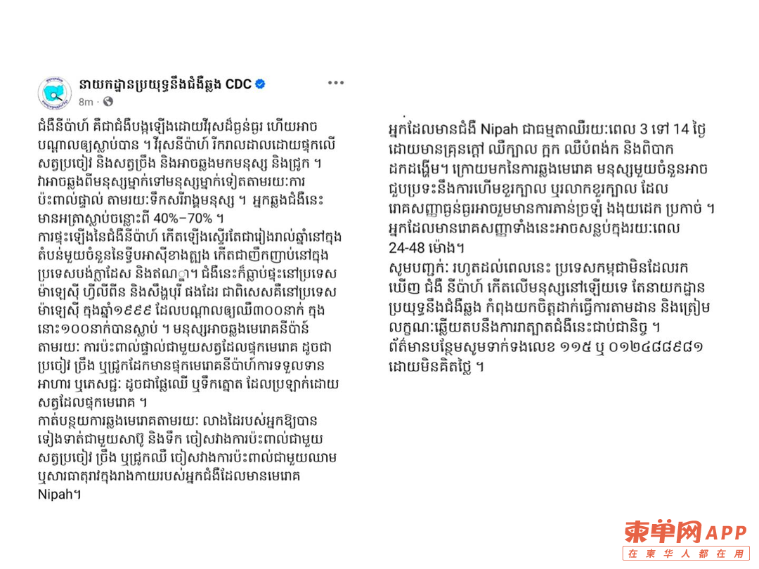 尼帕病毒引关注!官方通报:柬埔寨未发现病例,公众无需恐慌