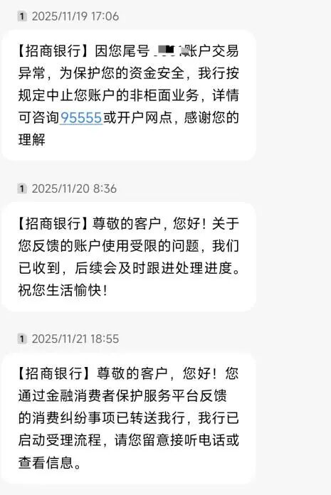 王霖(化名)的银行卡则是因为收到其他人大额转账被判定交易异常。他向中新网介绍,自己在2025年11月收到招商银行的短信,其中通知写明他的账户交易异常,为保护资金安全,银行按照规定中止账户的非柜面业务。
