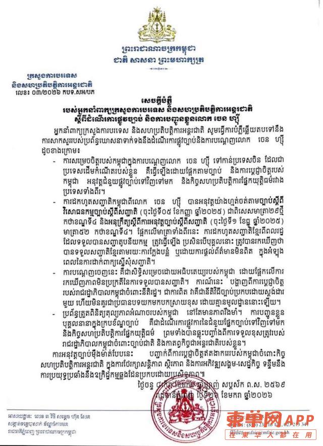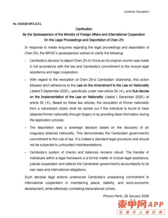 柬单网报道,1月26日,柬埔寨外交与国际合作部(简称外交部)就中国籍人士陈志在柬埔寨的法律程序、国籍撤销及遣返中国一事发布正式澄清通告,强调相关决定完全依法作出,属于国家主权范围内的正常法律程序,不应被外界误读。