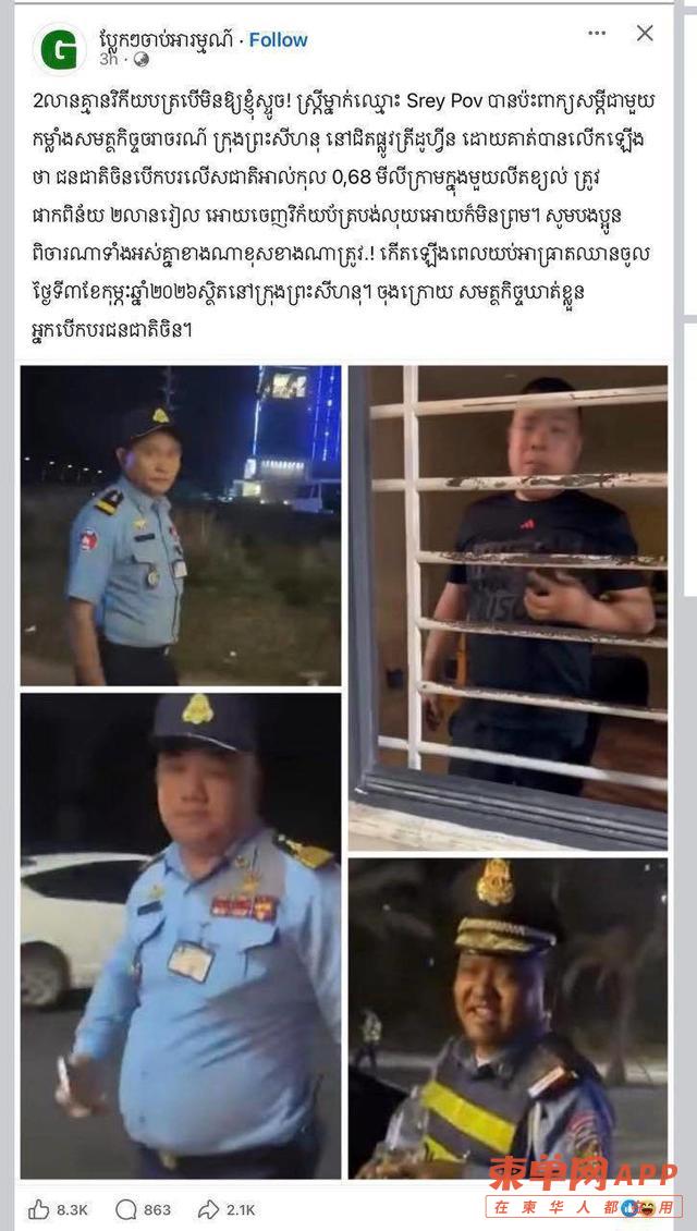 随后,脸书账号“奇闻趣事”发布相关视频并配文称“酒驾被罚200万瑞尔却不开收据”,并点名一名叫“Srey Pov”的女子,称其与交警发生言语冲突,质疑警方对酒精含量为0.68毫克/升的中国籍司机执法程序不规范,并呼吁网民“评理”。该帖还称事件发生于2月3日凌晨,最终警方将涉事中国籍驾驶人带走。