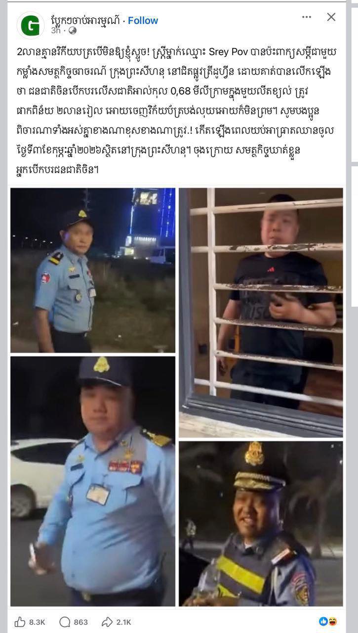 柬单网报道,针对近日引发社会关注的“中国籍司机酒驾遭处罚”事件,西港省警察局陆路交通警察办事处主任倪占诺拉于2月3日通过视频形式,向公众详细说明事件经过,并就相关执法程序作出澄清。