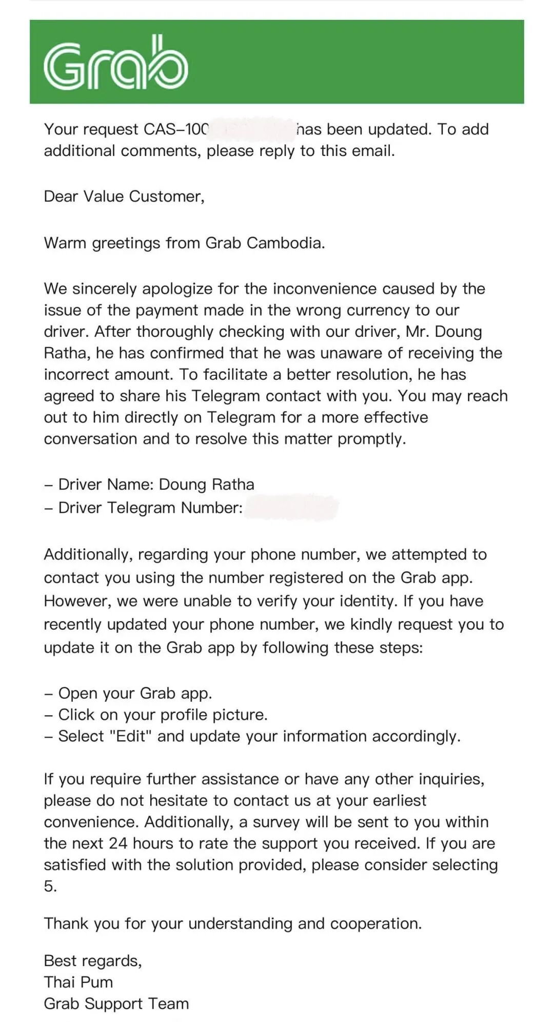 回到家中,张张情绪跌到谷底,连饭都吃不下。就在她准备彻底放弃时,一封来自grab的邮件悄然弹出。邮件中写道:平台已联系到该名司机。对方称“并不知情”,但愿意提供联系方式,配合沟通退款事宜。