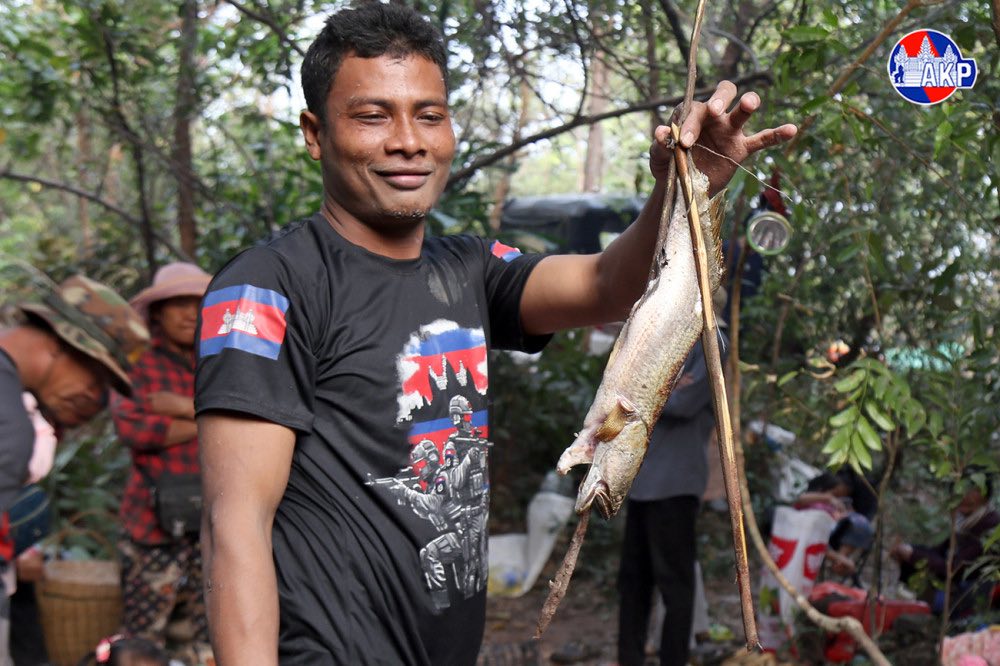 一名来自暹粒市的参与者亮出一条当天所捕获的现场烧鱼