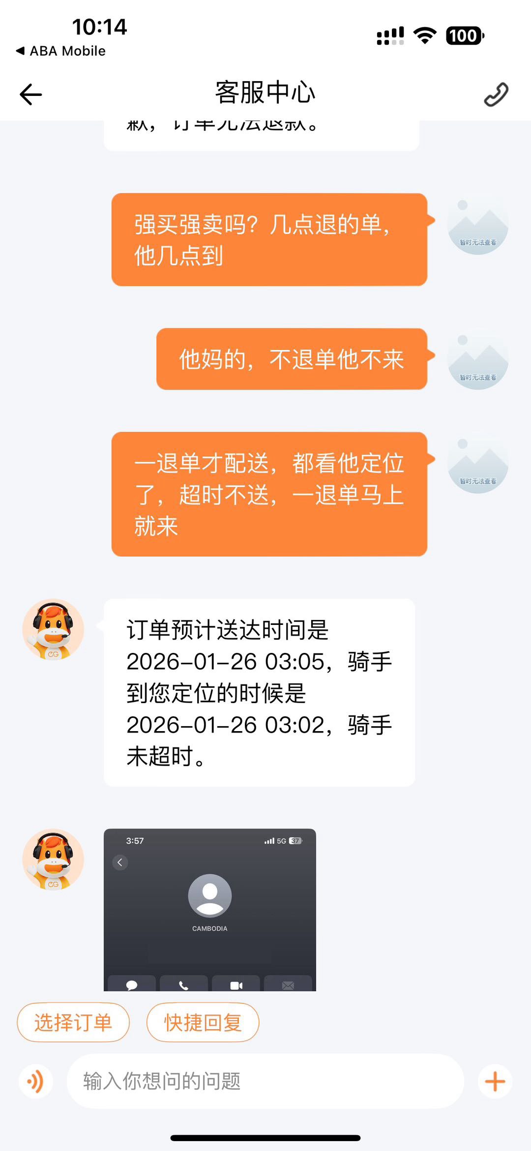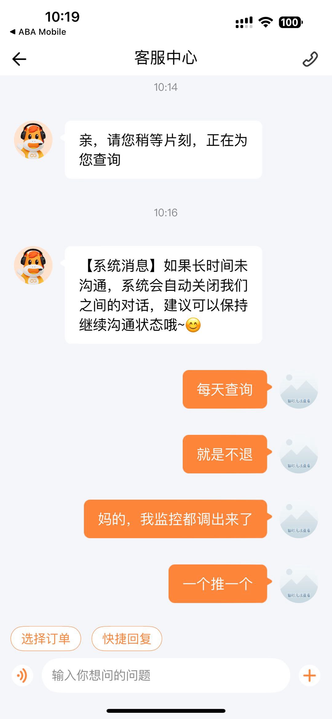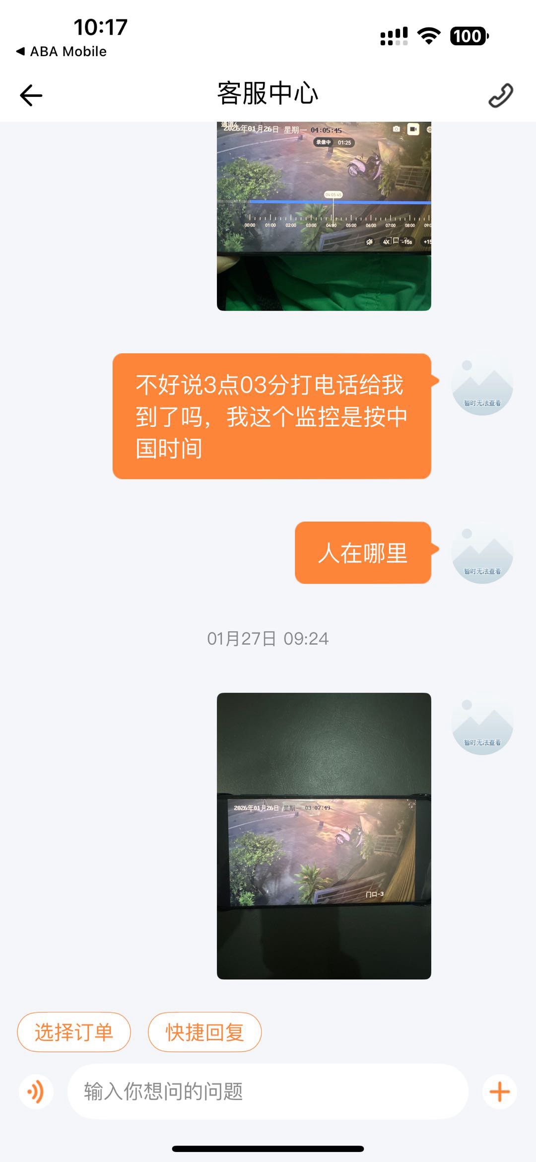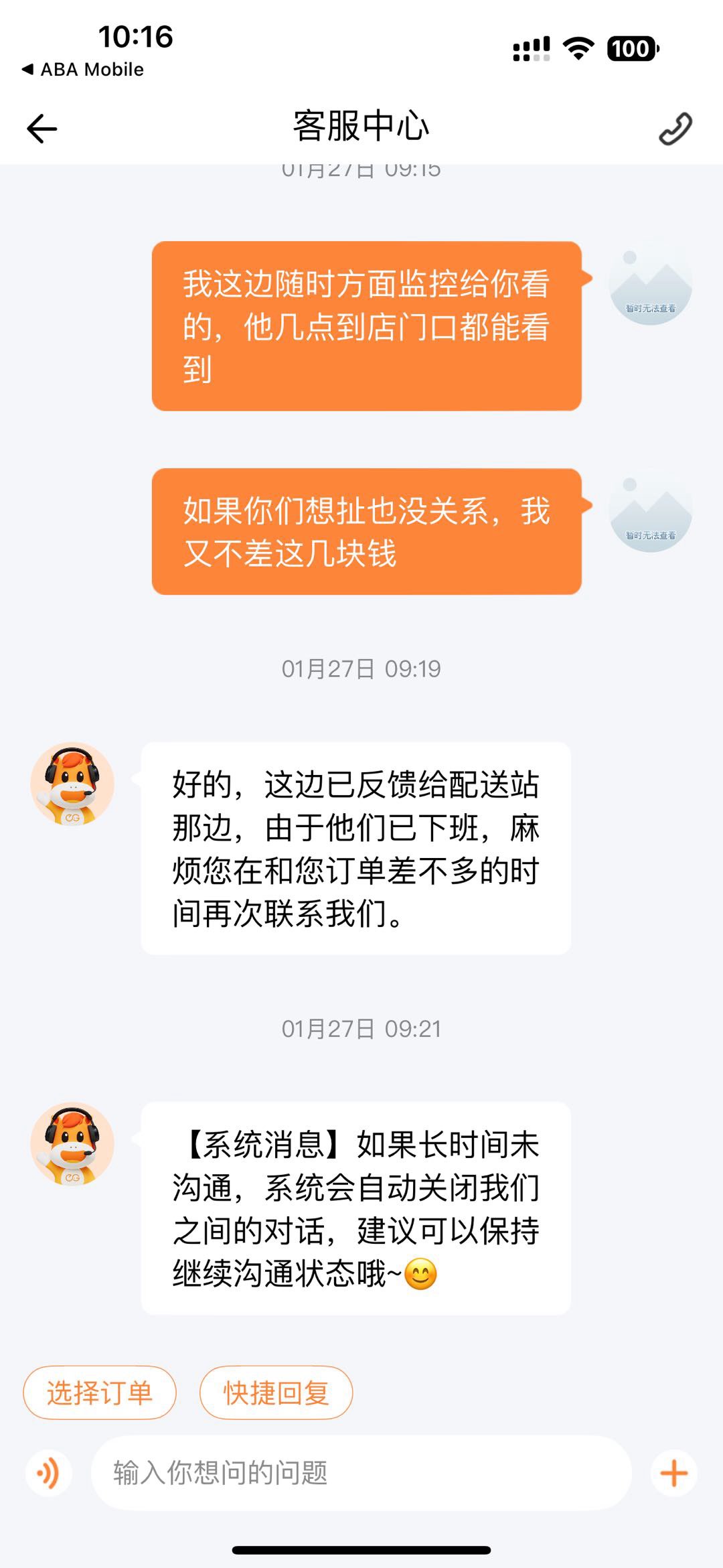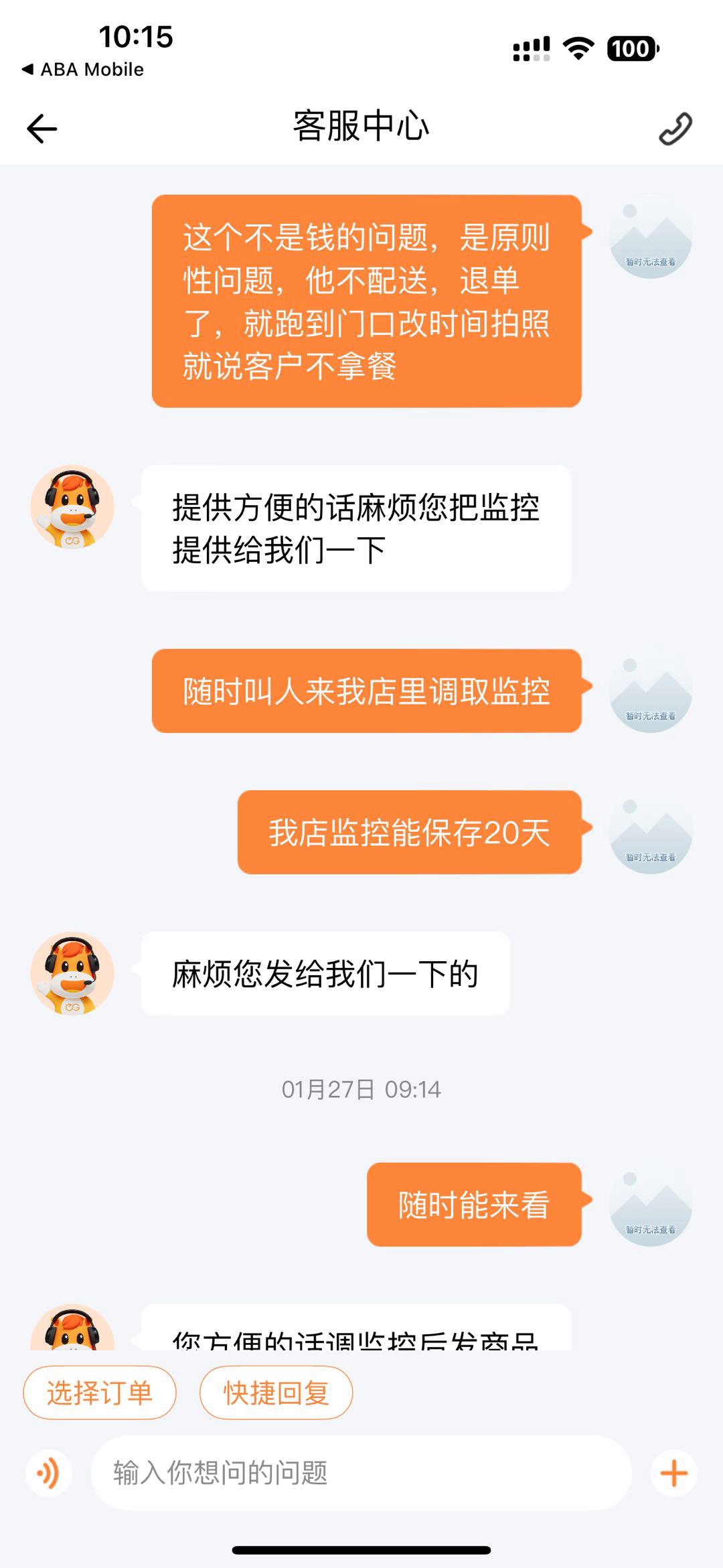 找客服就一个拖一个,我监控都调出来给他看了,骑手几点到,几点打电话给我都给客服了。过了十几天了就是不处理