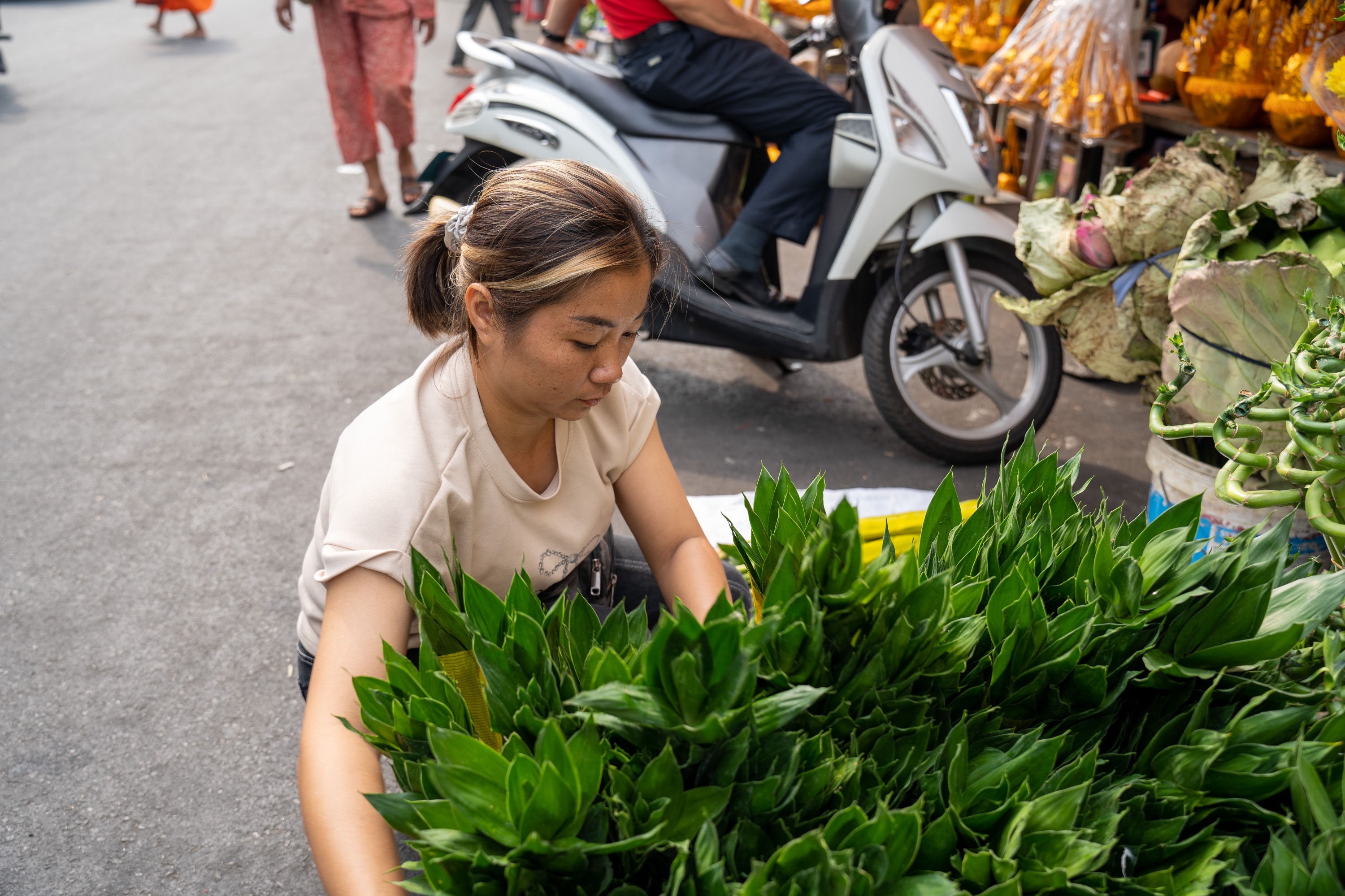 达琳正在摆放万年青,给客人供货。(来源柬单网图片库)