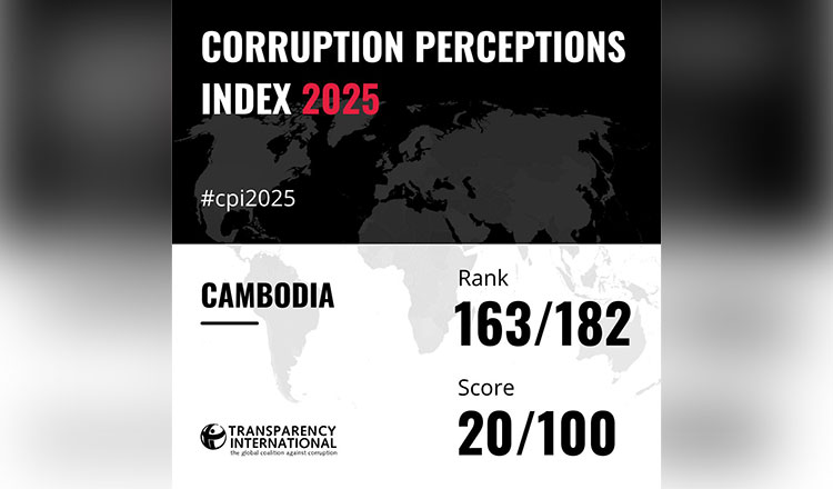 根据国际透明组织2月10日发布的报告,2025年全球共有182个国家和地区被纳入评估,评分范围为0至100分,分值越高代表公共部门越廉洁。柬埔寨本年度得分为20分,较2024年的21分略有下降,全球排名第163位。在东盟国家中,柬埔寨排名倒数第二,仅高于缅甸。报告同时指出,2025年全球平均得分为42分,为十多年来最低水平,超过三分之二的国家得分低于50分。