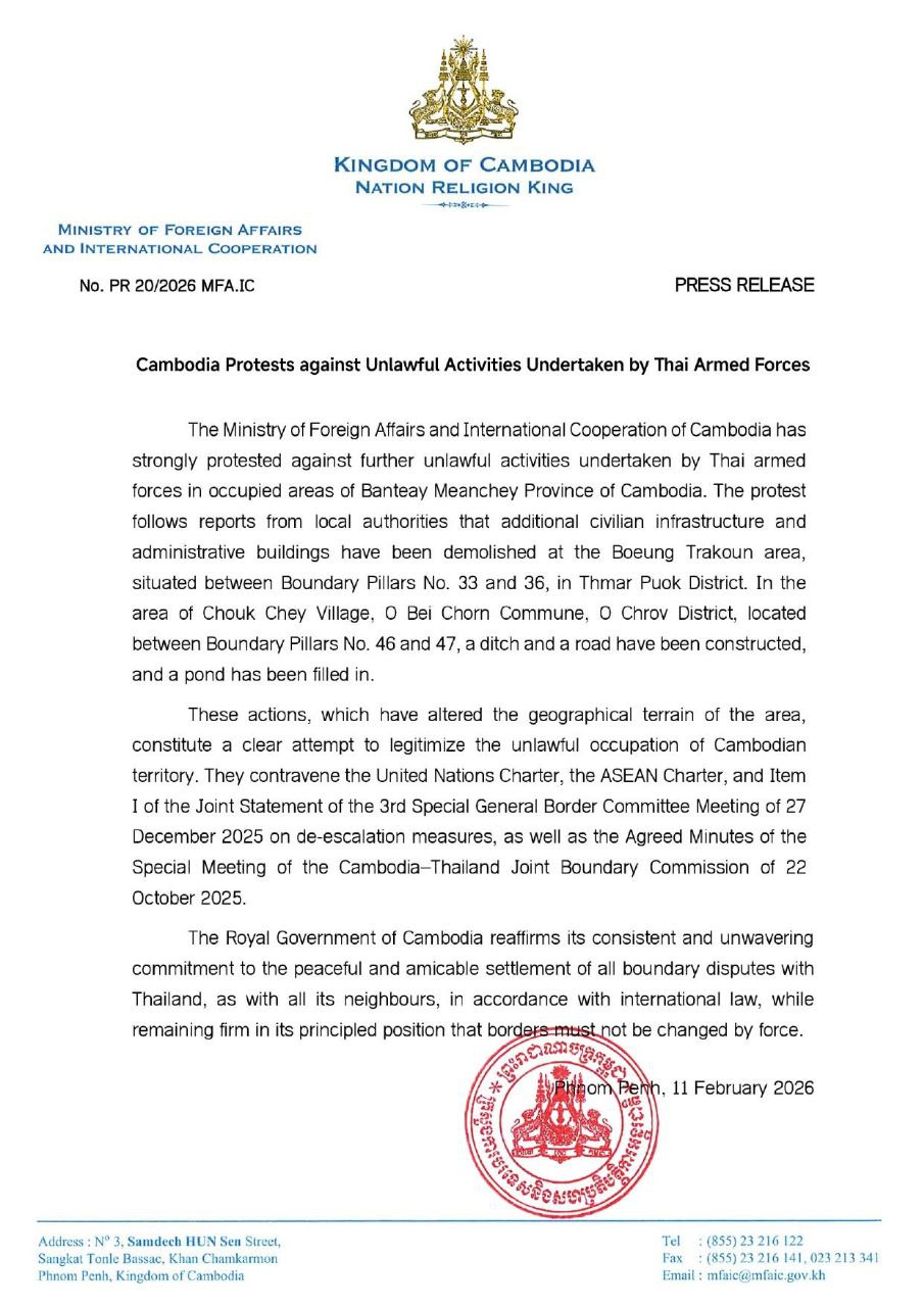 柬单网报道,2月11日,柬埔寨外交与国际合作部(外交部)发表声明,就泰国武装部队在柬埔寨领土内持续开展的相关活动提出强烈抗议,指相关行为严重侵犯柬埔寨主权,尤其涉及卜迭棉芷省部分边境地区。