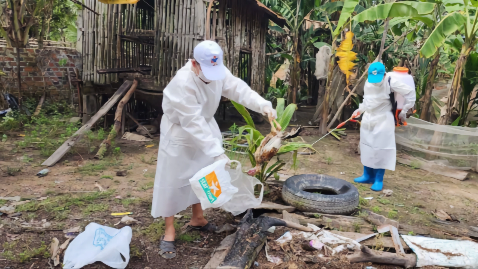 相关工作人员在进行消杀处理和疫情防控,清理疑似感染H5N1禽流感的死禽及生活垃圾,以防止病毒在社区传播