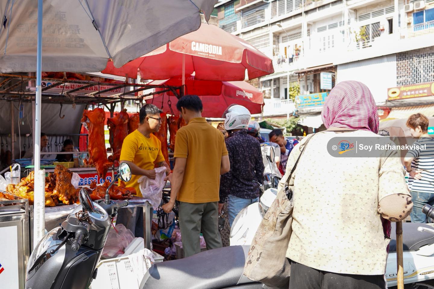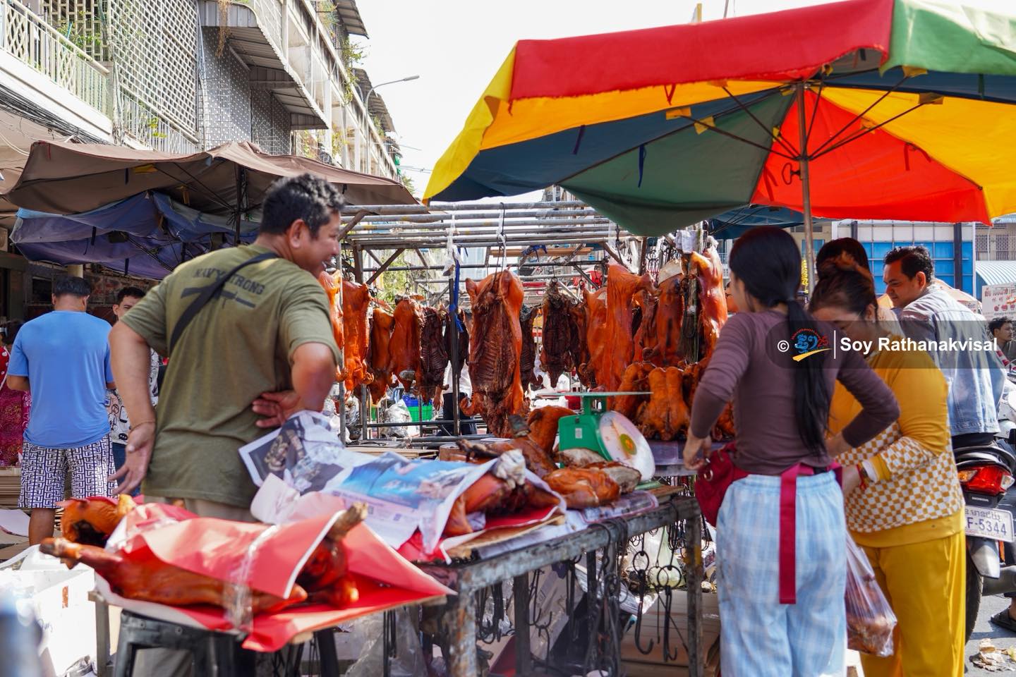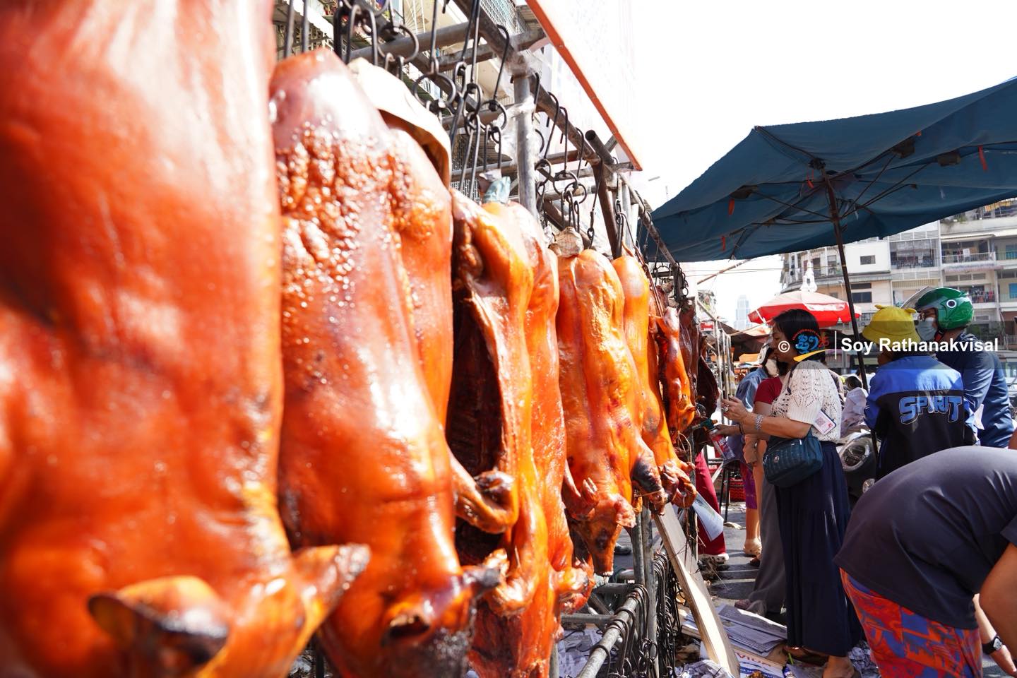 除夕热闹场景:金边乌亚西市场烧猪烤鸭畅销