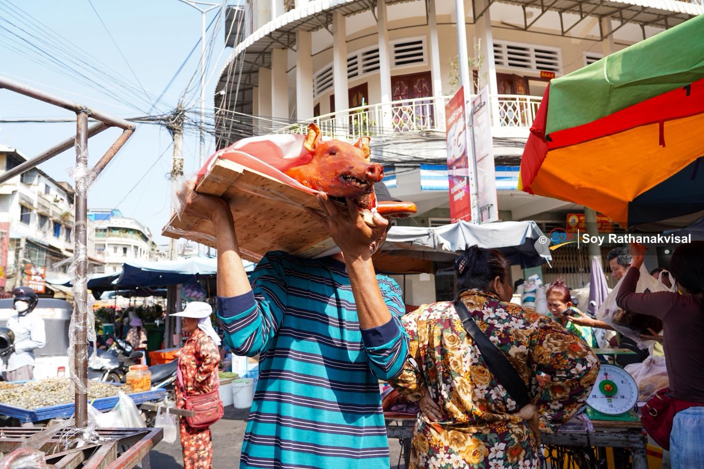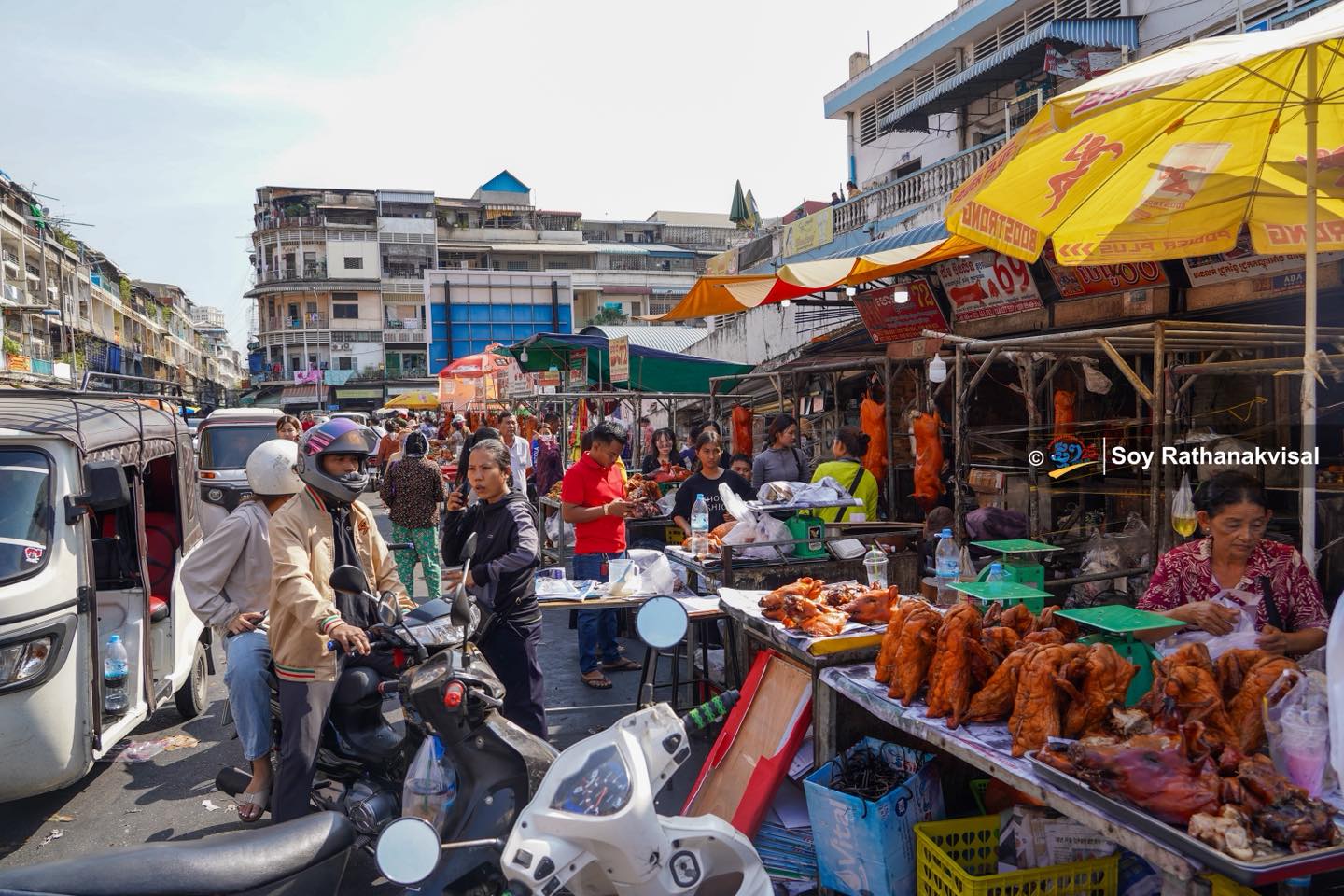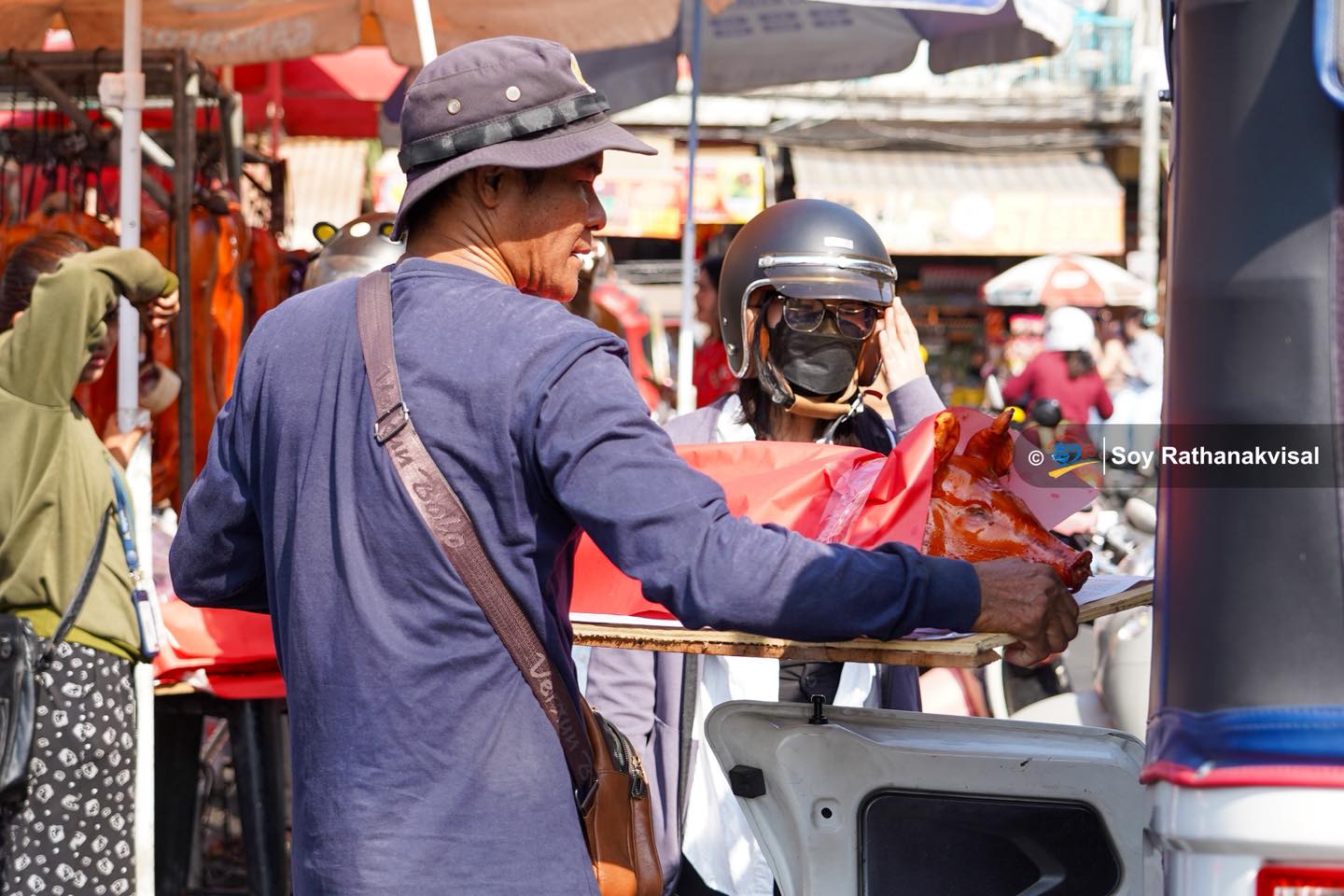 除夕热闹场景:金边乌亚西市场烧猪烤鸭畅销