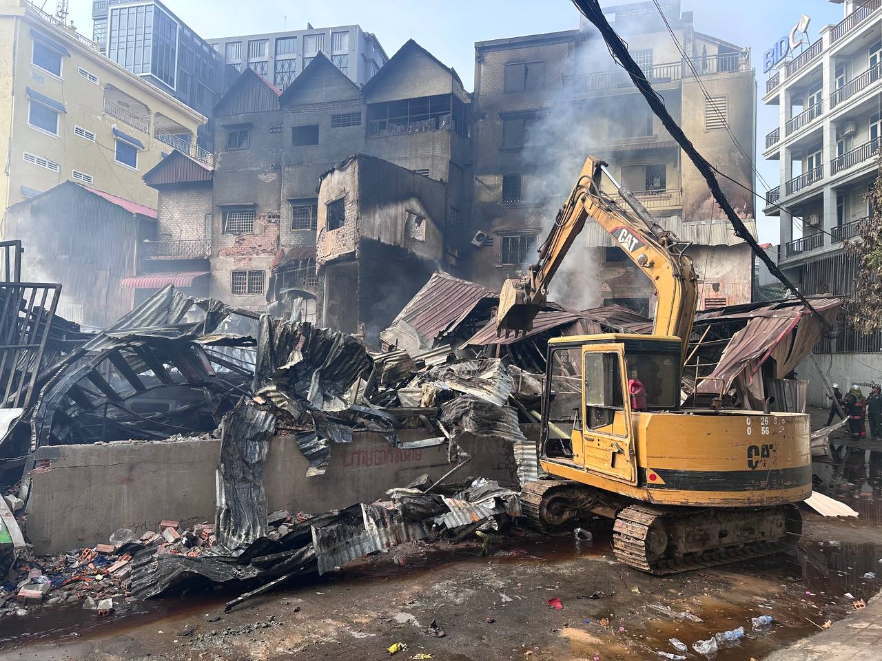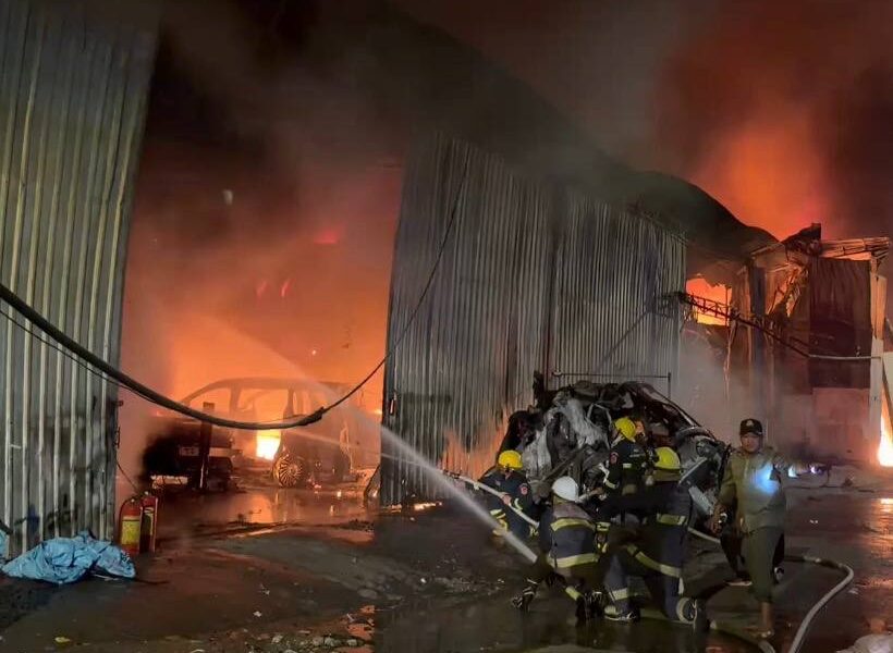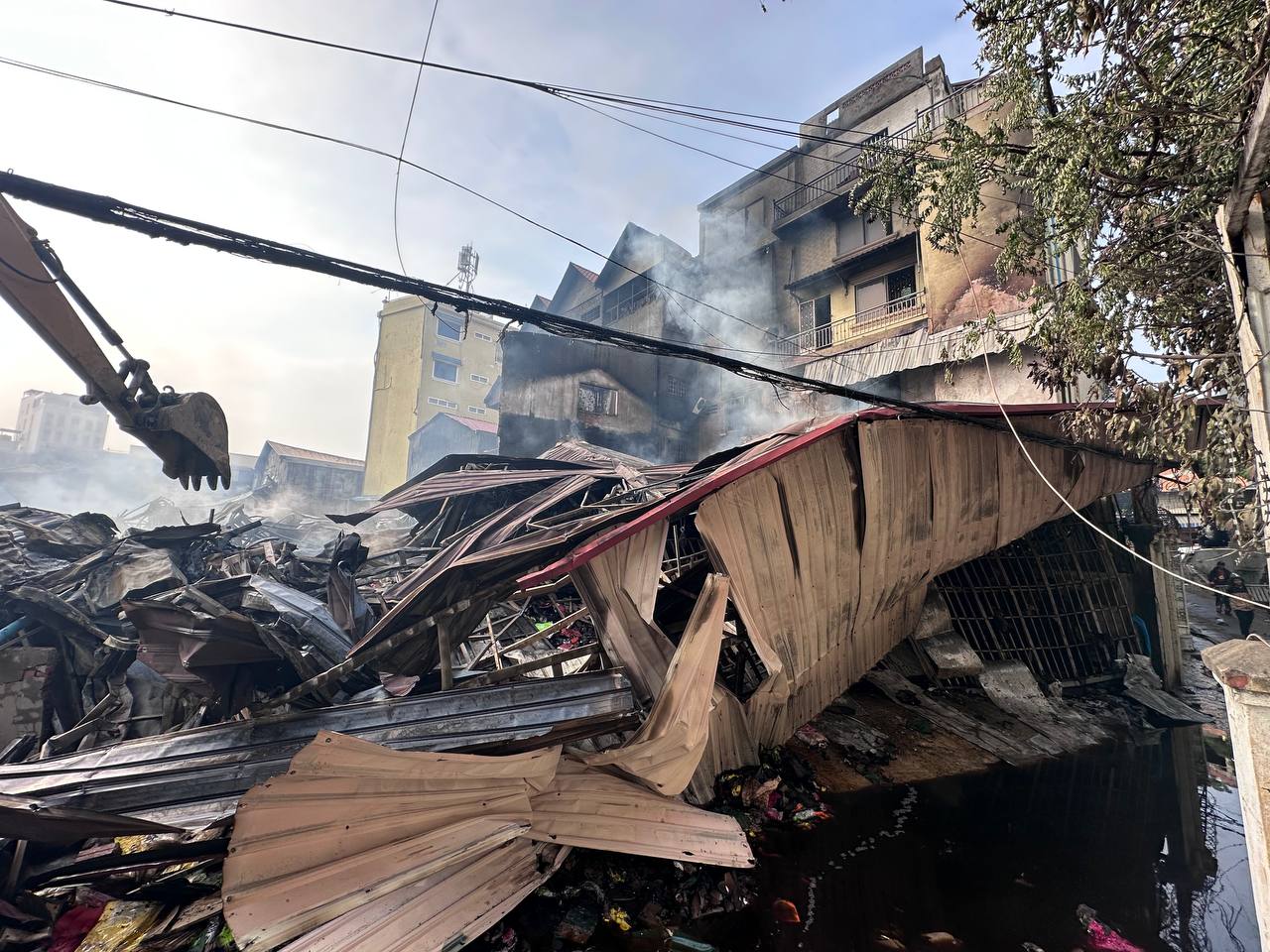 金边堆谷区大火现场,火势蔓延至多个仓库和住宅,造成数百万美元损失