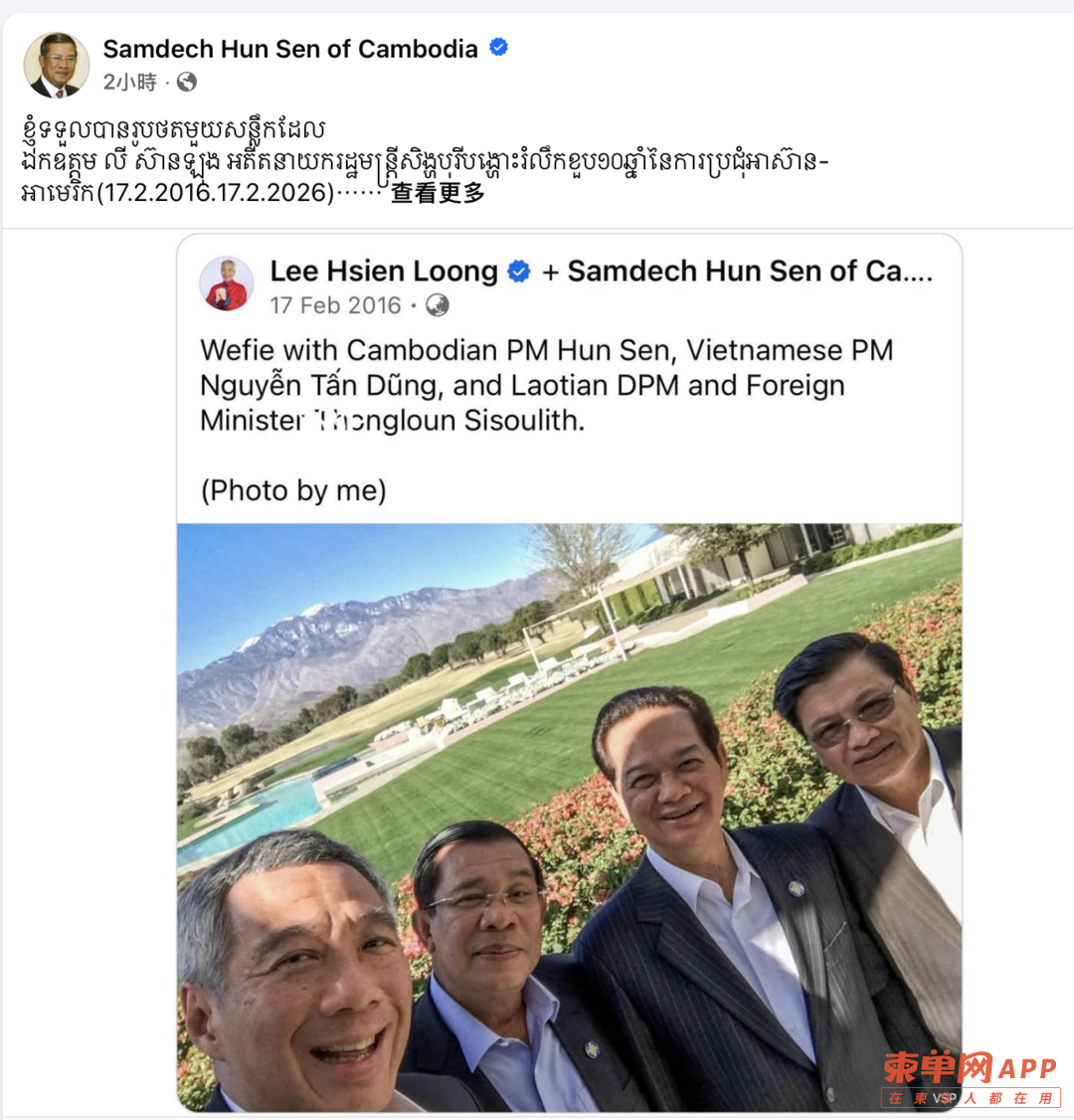 洪森在配文中回忆称,当年这张合影正是由李显龙亲自拍摄,并发布在其个人脸书账号上。此次适逢东盟—美国领导人会议召开10周年(2016年2月17日—2026年2月17日),李显龙再次分享该照片,他也因此得以重温当年的珍贵记忆。