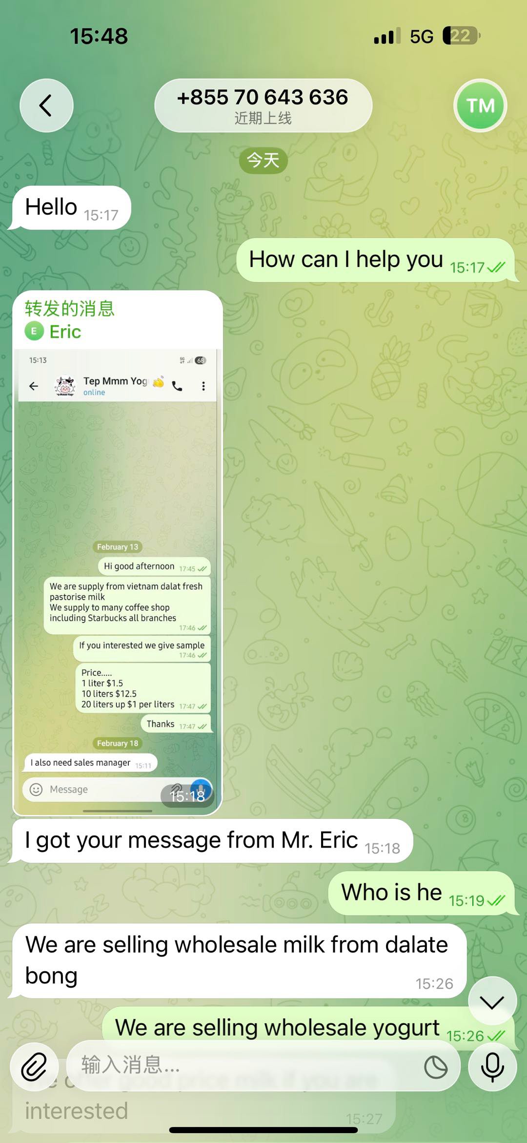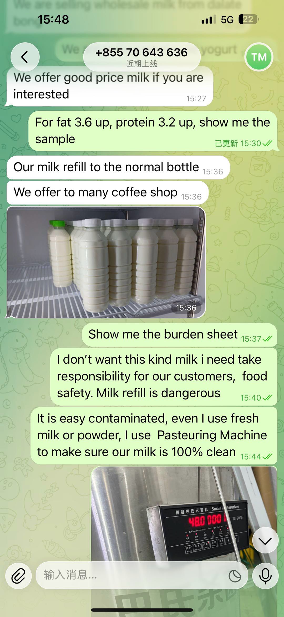 身在柬埔寨,虽然法律监管不是那么健全,但是作为餐饮从业者,我们也要努力做良心商家。经常会遇到一些无良供应商,这次遇到的是卖牛奶的,牛奶这个东西稍微不注意就容易被污染滋生细菌,一般出厂都要经过巴士灭菌,无菌车间生产。一些小咖啡店什么的为了降低成本拿这种货,瓶子就用喝完的的矿泉水瓶子装,以这里的条件,怎么可能不被污染,我做干噎酸奶一次要用几十公斤,都是国内物流发过来,我还不放心,特别还用巴士灭菌罐再次消毒,确保食材安全卫生。大家在外面喝咖啡尽量不要去那种小店,太不安全啦。