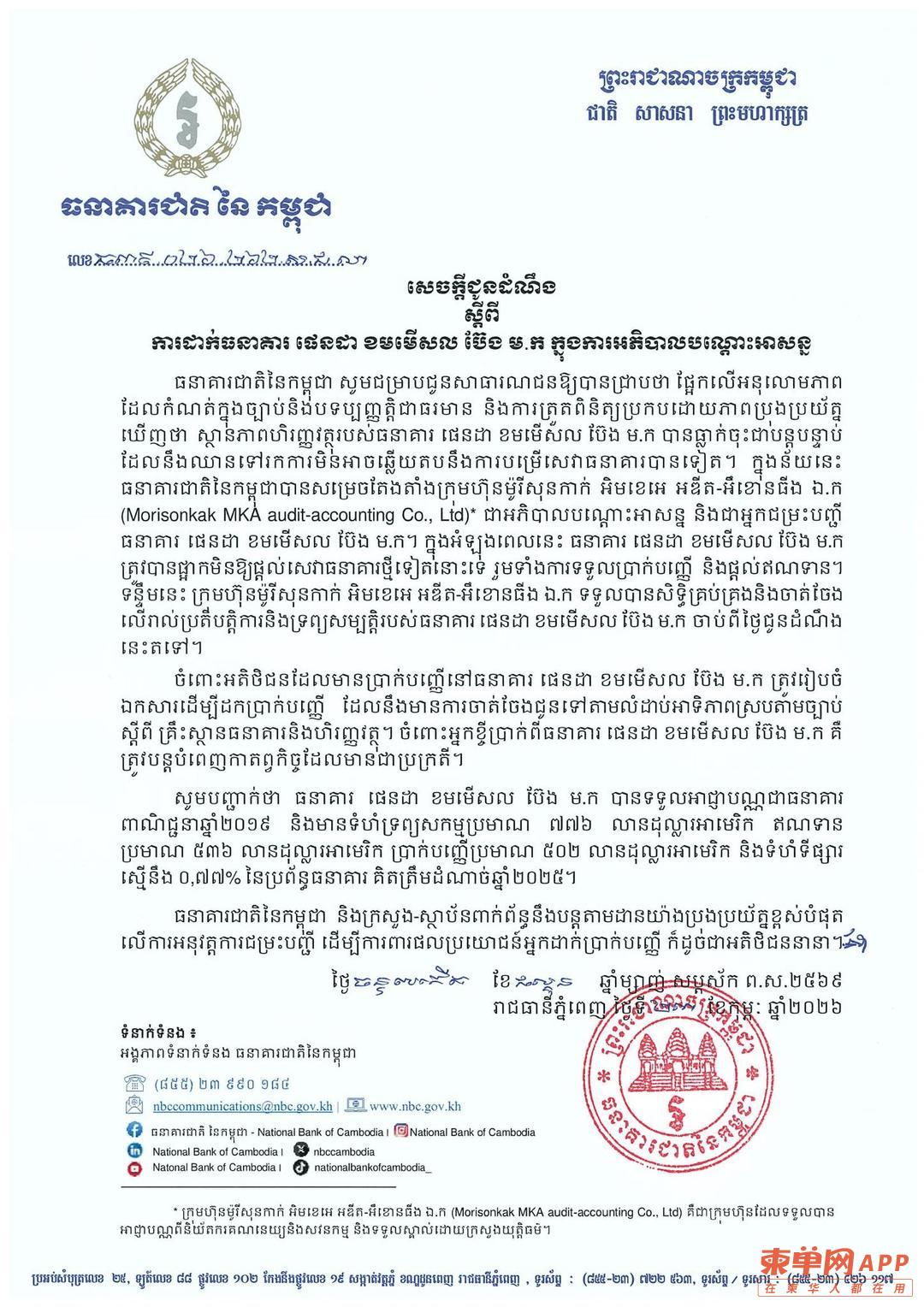 柬埔寨国家银行强调,将持续高度关注清算工作进展,确保存款人及其他客户的合法权益得到保障。