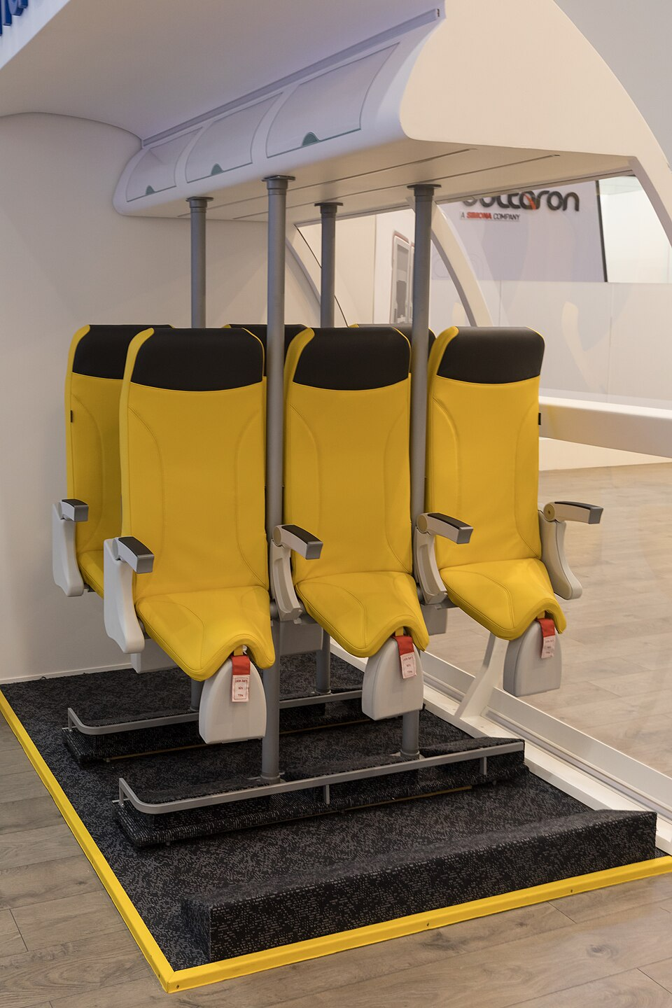 2018年汉堡飞机内饰博览会上展出的站立式座椅概念模型。该设计通过马鞍形坐垫迫使乘客保持“半站立”姿态,将座椅间距压缩至极限,以实现机舱空间利用率最大化 / Wikimedia Commons