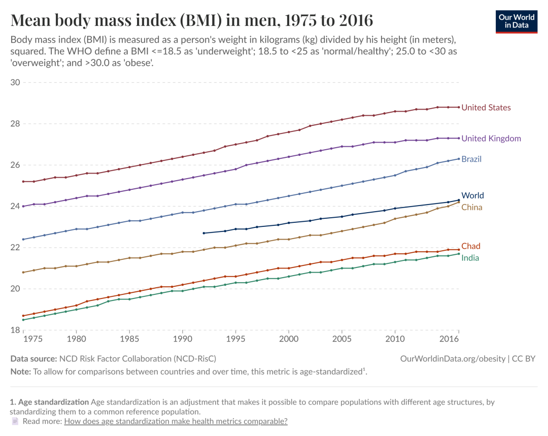 1975–2016年间,男性平均BMI总体呈上升趋势。全球男性平均 BMI 从1992年的22.7kg/m²上升至2016年的24.3kg/m²;中国男性平均BMI从1975年的20.8kg/m²上升至2016年的24.2kg/m²。体型膨胀的现代人被塞进逐渐缩水的狭窄座椅里,让每一次长途飞行都像是坐牢 / [19]