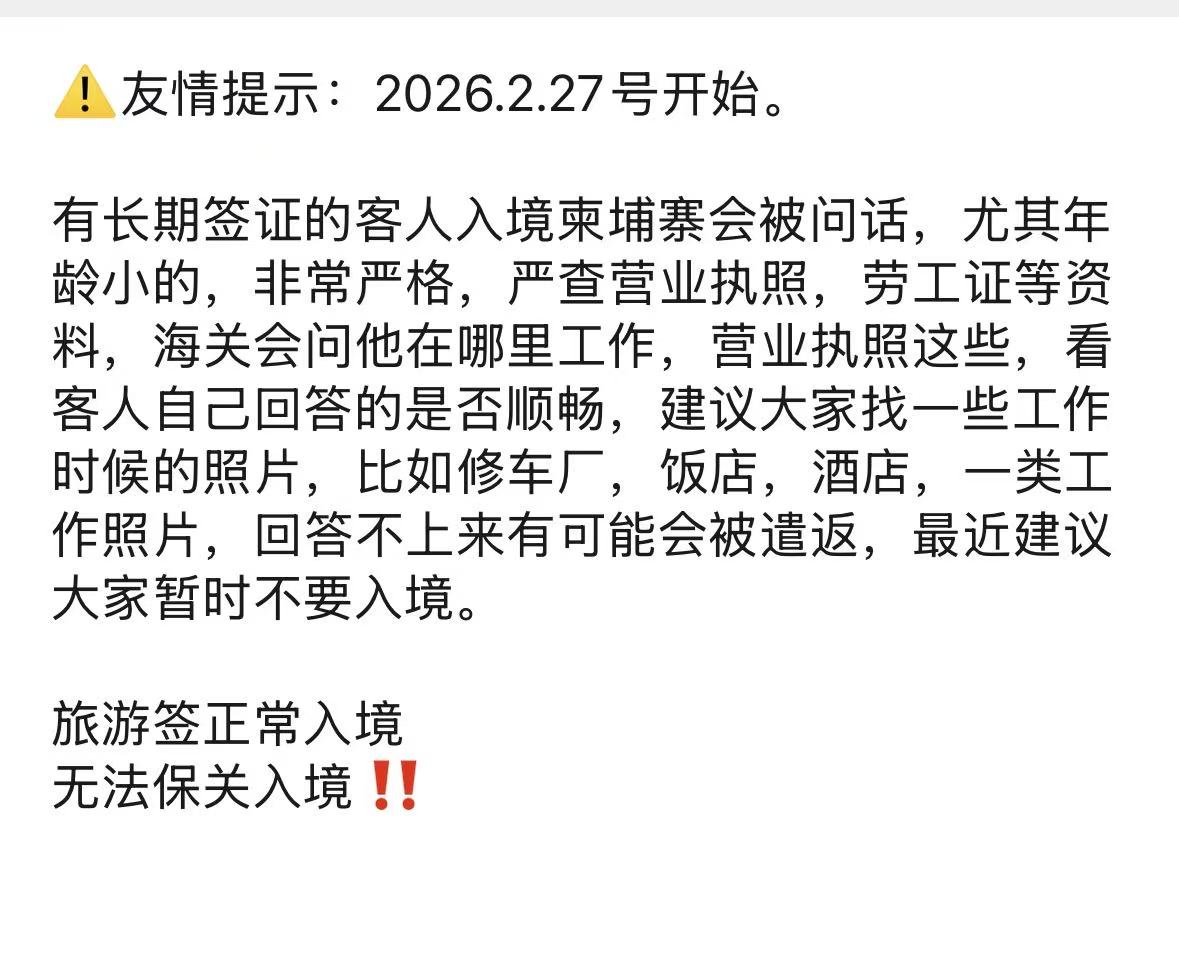 自2月27日下午起,柬埔寨金边、西港多家旅行社及出入境中介机构陆续发布紧急通知,称即日起暂停为所有入境的外籍人士办理落地商务签证。与此同时,旅游签证仍可正常办理。