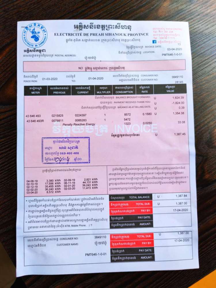 黄总 发表于 2020-4-15 17:25 目前,电费是按照比例来收的,每月使用不足10度电的人,每度380瑞尔(0.095美元);11度-50度,每度480瑞尔; ...
