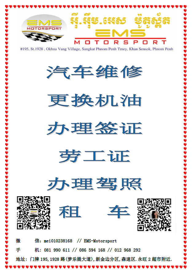 柬漂之路同胞互助,我们的专业就是将您的爱车维修好得完美如新,中 柬 英语交流,沟通无阻,专业的汽修维护团队,随时待命。联系人:黄樱樱 手机: 081 990 611 / 086 594168