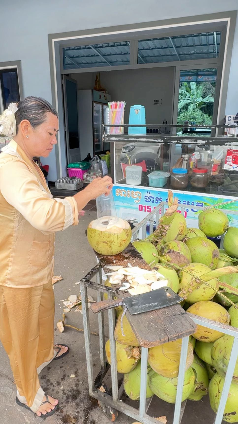 柬埔寨这边最多的水果之一就是椰子,这么一个新鲜的冷冻椰子,只需要3500柬币(大概6人民币左右),是真正的新鲜健康的天然饮料! ផ្លែឈើមួយប្រភេទដែលសម្បូរជាងគេនៅកម្ពុជា គឺដូង។ ដូងទឹកកកស្រស់មួយដើមមានតម្លៃត្រឹមតែ 3,500 រៀល (ប្រហែល 6 RMB) ។ វាជាភេសជ្ជៈធម្មជាតិស្រស់ស្អាត និងមានសុខភាពល្អ!